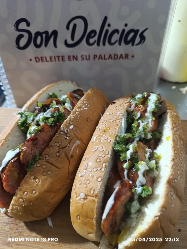 Chorizo tradicional, papas a la francesa, lechuga, queso costeño, papas chongo y salsas de la casa