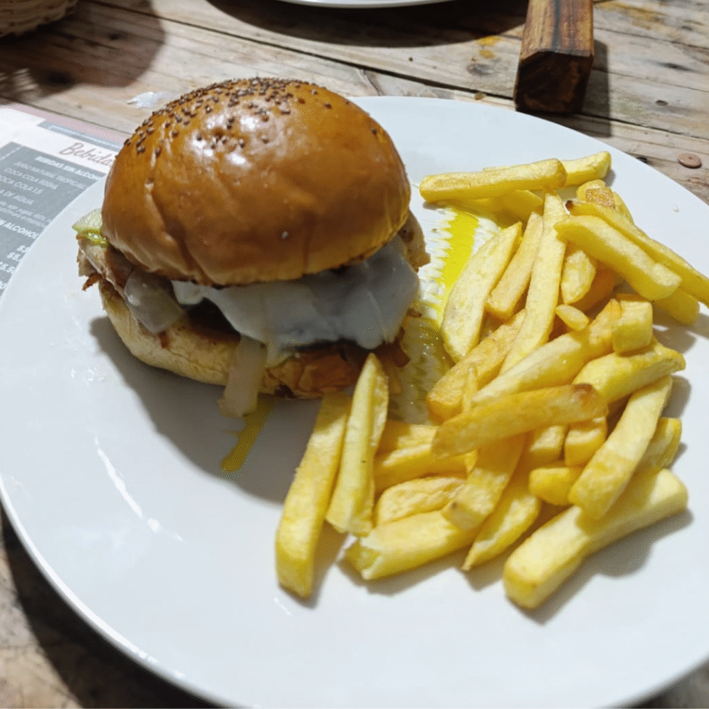 170 g de carne de res, tomate, cebolla, lechuga, queso morarella y salsas de la casa