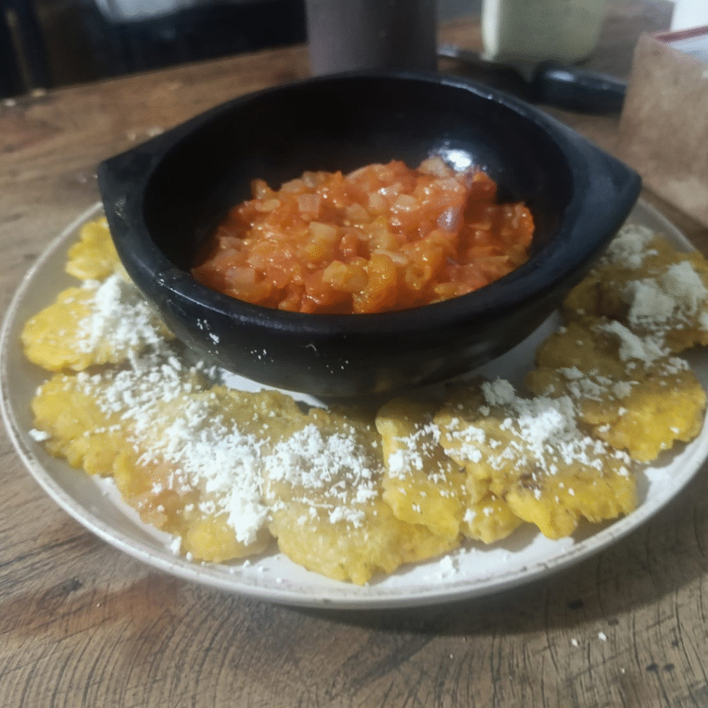 Patacón con ahogao de tomate y cebolla
